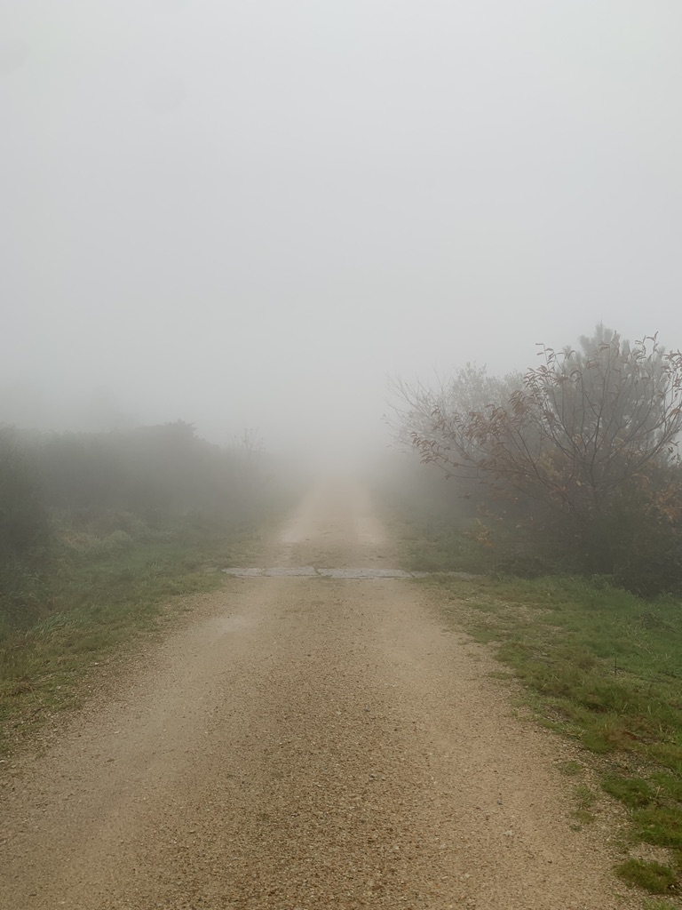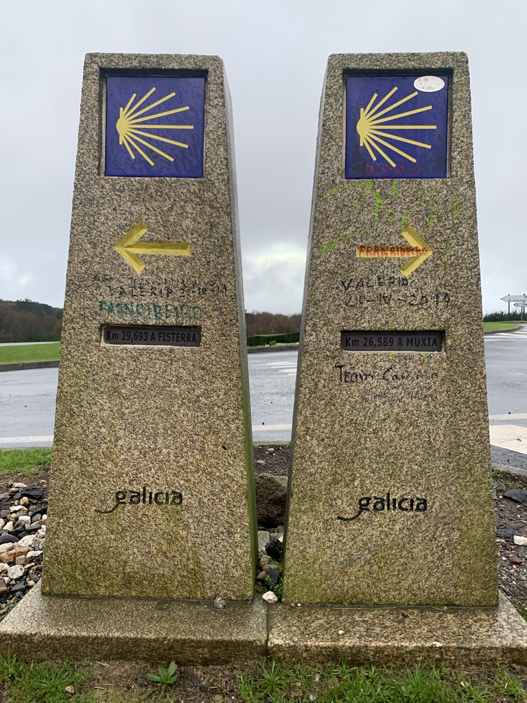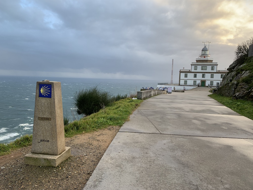 La dernière journée de notre périple aurait dû être à Muxia, mais le chemin en a choisi autrement. Cette journée débute sous un brouillard à couper au couteau et sous un vent des plus violent. Nous avançons non sans mal, mais le but est si proche que ce sont nos tripes qui nous permettent de mettre un pied devant l’autre. Puis nous croisons la pluie. Lorsque celle-ci se calme, le vent prend très clairement le relais et nous arrivons trempés et frigorifiés à Cap Finisterre.