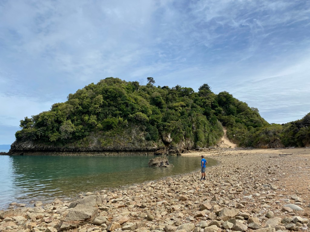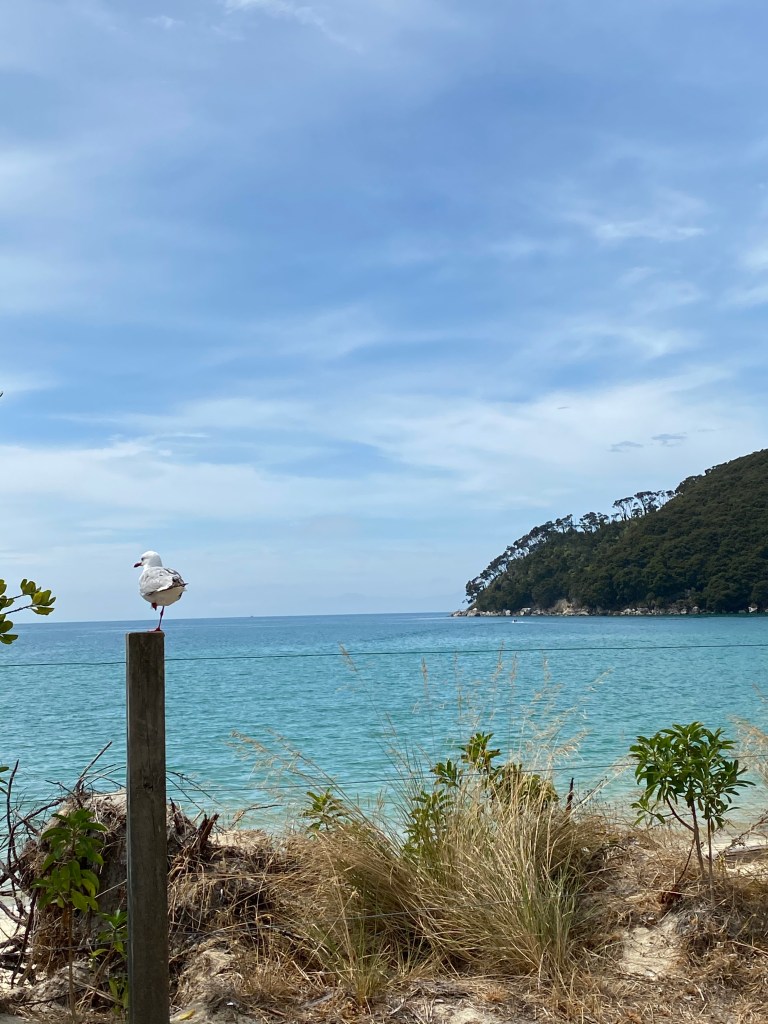 Nous attaquons donc à 11h du parking de Marahau. Nous nous arrêtons sur une jolie plage pour pique niquer. Une mouette fait son dessert du sac de fruits secs que nous oublions de fermer ! Nous continuons d’apprendre…