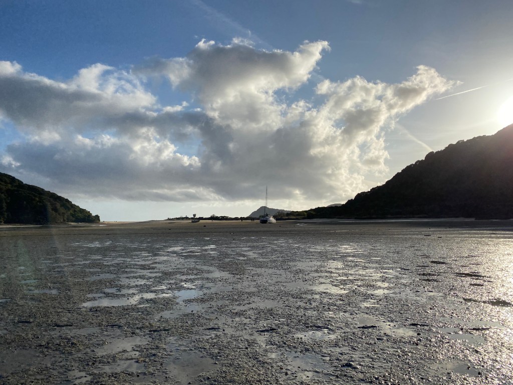 Et cette arrivée tôt, nous permet de voir le prochain estuaire à traverser pour le lendemain matin. Il est plus grand que les deux autres et il est nécessaire de le traverser vraiment à marée basse, car il n’y a pas d’itinéraire bis. Mais ça va le faire. Deuxième dîner à base de noodle et de soupe. Cette fois ci, je les « noie » dans 500ml d’eau à chaque fois histoire d’avoir l’impression d’être full. Car on mange peu le midi donc le soir manger chaud et « beaucoup », c’est salvateur… C’est très chouette d’apprendre dans ces conditions.