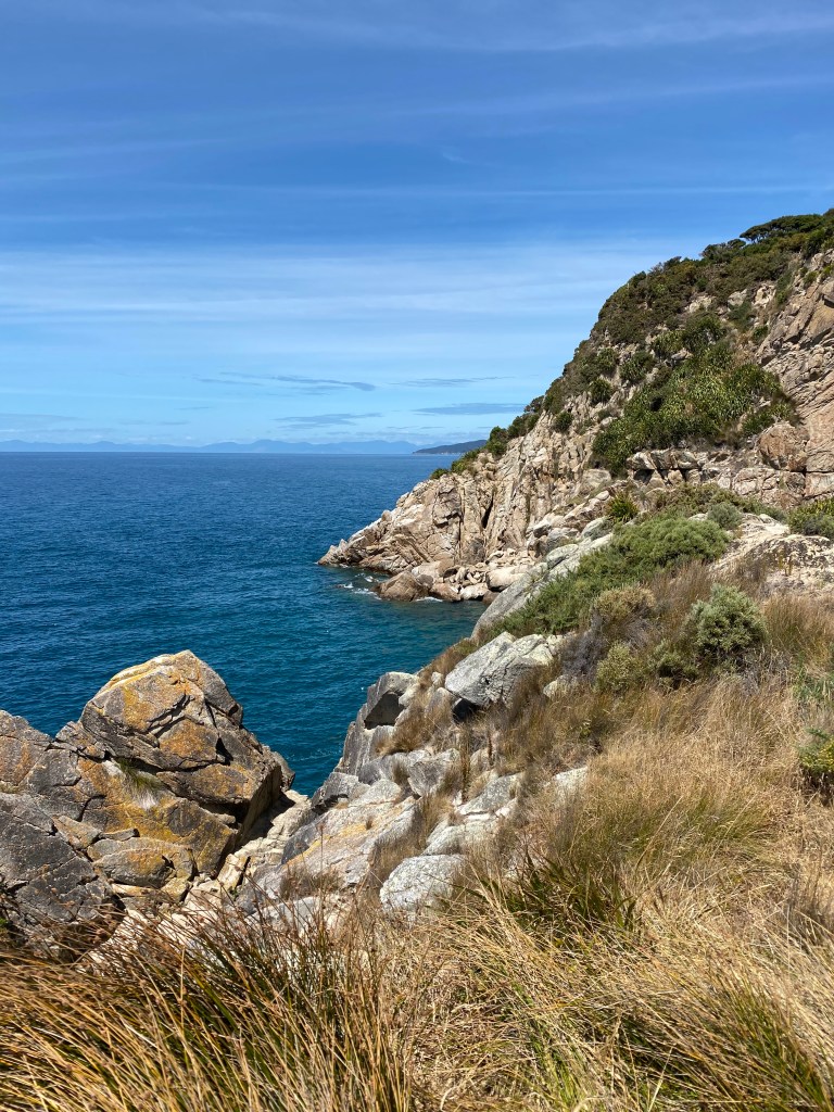 Moi qui pensais que ça serait plat, ce n’est pas vraiment le cas. Ça monte et ça descend pas mal. Pas de gros gros dénivelés, mais mine de rien ça use. Les vues sont magnifiques cependant et le temps est au rendez-vous. Ciel bleu, mer azur, soleil… Bref le paradis.