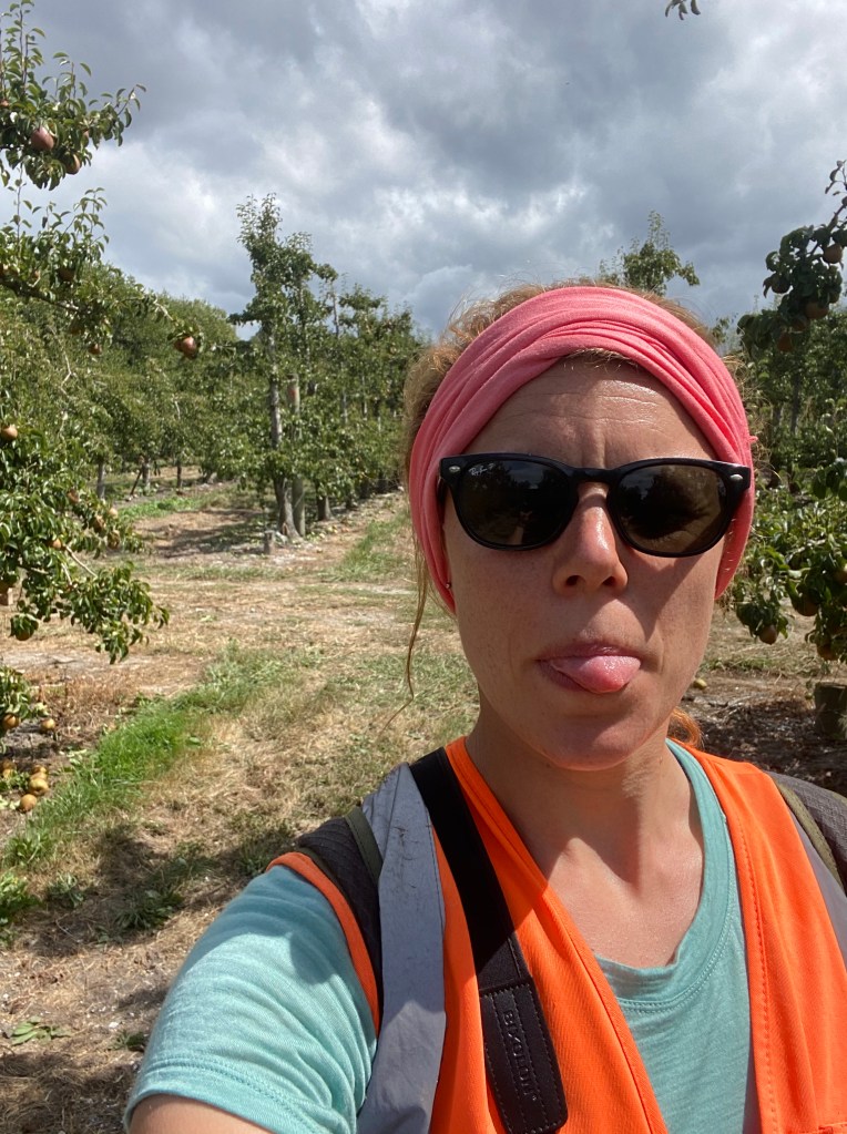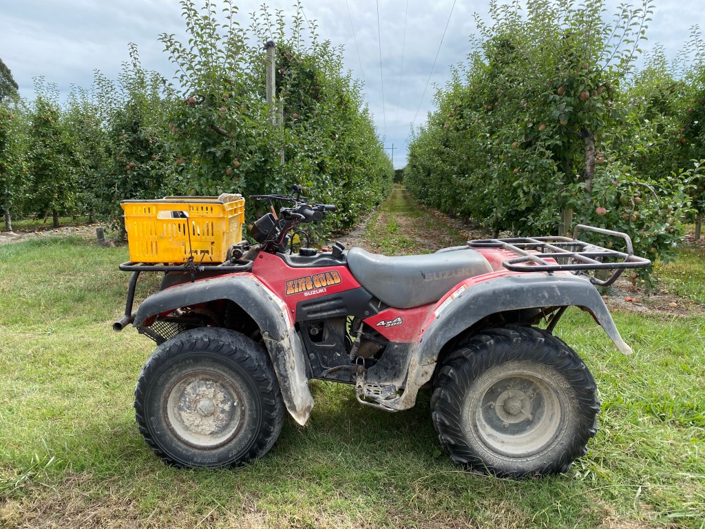 Mon travail consiste à vérifier que le ramassage soit bien accompli : c’est-à-dire, pas de dommage sur les fruits, pas trop de fruits par terre et pas trop de fruits oubliés dans les arbres. Un comble, je n’ai jamais ramassé de pommes/poires de ma vie ! À cela, il faut ajouter la tâche la plus passionnante : étiqueter les caisses (une fois remplies) afin de tout comptabiliser comme il se doit. Ce n’est pas dingue dingue, mais c’est beaucoup moins usant que leur travail à eux ! Qui plus est, je suis dehors, je me balade de ramasseur en ramasseur (environ 10-13km par jour mine de rien) et je profite du temps clément du Nord de l’île du sud ; donc ce n’est pas non plus horrible.